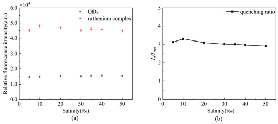 Stability of the oxygen sensor under different salinities (a) changes in fluorescence intensity of the two fluorescent dyes, (b) changes in fluorescence quenching ratio.