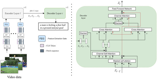 However, there are some limitations to the traditional feature extraction model. While a weight-freezing network is efficient for feature extraction, it has the disadvantage that it does not update while the entire model is training on new data. In addition, because it is based on CNNs, and since CNNs have a local receptive field, it makes the performance bound. In contrast, the transformer has a global receptive field because of the self-attention layer, improving the model performance when pre-trained well. In many fields [8,9,10], transformer networks outperform CNNs. Therefore, attempting to convert CNN-based feature extraction models to transformer-based models is natural. Inspired by recent studies that apply transformer networks to vision tasks, we propose the full transformer architecture for video captioning. From feature extraction to the part that extracted appearance features, proceeding through to the transformer. We make the model consisting of the (ViT) [11] and adopt end-to-end learning. Moreover, the feature extraction gate (FEG) is proposed to acquire a much better understanding of visual features. The FEG is used to obtain better information and combines CLS token information and previously discarded patch sequence information to extract information that better contains visual content.