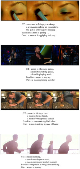 We show qualitative results with our model and the baseline model. This baseline model means the ViT + vanilla transformer without the FEG and the UEA. “Ours” means our full model with the FEG and the UEA. Figure 3 shows that the baseline model could not catch some important words. However, our model catches words such as “running”, “makeup”, and “bread”. This shows that our approach affects the model performance directly. Figure 4 shows qualitative results on the MSRVTT dataset.