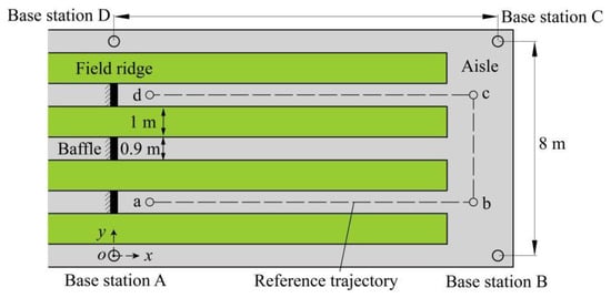 The experiment was performed in a vegetable greenhouse at Yunyuan Scientific Research Base of Hunan Agricultural University, Changsha, Hunan Province, China. As depicted in Figure 3, the layout in the greenhouse consisted of four field ridges, three aisles between ridges and a longitudinal aisle. The width of the field ridges is 1 m, and the width of the aisle between ridges is 0.9 m. The above aisles were paved with cement. Vegetable crops with an average height of 0.4 m were planted on the field ridges. A square area of 14 m by 8 m was selected for the test site, and a baffle was adopted to separate the test area in the aisle between ridges. Four UWB base stations were set at the four vertices of the test square area, respectively, and then fixed at a height of 0.7 m above the ground with a support. A 2D positioning and navigation coordinate system was built (Figure 3) with base station A as the origin of the coordinate system. The reference trajectory and four inflection points, including a (1.80, 1.80) m, b (12.60, 1.80) m, c (12.60, 5.65) m, and d (1.80, 5.65) m (Figure 3), were preset in the test site. During the test, the remote monitoring platform was employed to remotely monitor and record the real-time data of the robot platform via Wi-Fi.