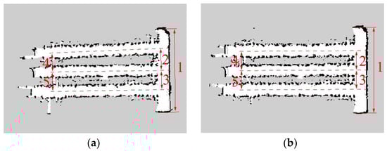 In this paper, the navigation boundary was obtained by scanning the crop-row and the sidewall of greenhouses with LIDAR [32,33]. The robot platform was manually controlled to move in the cement aisle area of the greenhouse in accordance with the same moving track and completed the map construction. A combination of the EKF algorithm and the AMCL algorithm is utilized for combining the data in the IMU/ODOM/LIDAR integrated positioning method. Moreover, the map is constructed by integrating IMU/ODOM/LIDAR and UWB/IMU/ODOM/LIDAR with SLAM algorithm, respectively, as presented in Figure 4.