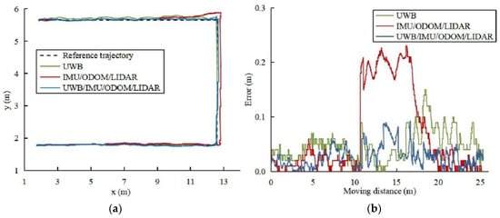 The constructed greenhouse grid map was loaded using the RVIZ software of ROS system, and the positioning data of the robot in the map was obtained by the AMCL algorithm. After the robot's pose was initialized, the robot platform was manually controlled to track the reference trajectory at the speed of 0.5 m/s and recorded the trajectory of the robot in various maps and the trajectory of the single UWB positioning in real-time, as depicted in Figure 5a. Compare the lateral error between the recorded trajectory and the reference trajectory, as depicted in Figure 5b.
