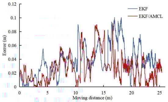 Based on the multi-sensor integrated method in reference [35], the EKF algorithm is adopted to integrate UWB/IMU/ODOM/LIDAR to compare the integrated positioning accuracy between the integrated algorithm in this paper and the conventional EKF algorithm. In the experiment, the robot platform adopts the single EKF algorithm and the EKF/AMCL combined algorithm to track the reference trajectory at 0.5 m/s, and the recorded lateral error results are presented in Figure 6. The lateral errors of the two integrated algorithms are analyzed, and the results are listed in Table 3. As revealed by the results, the maximum lateral error of single EKF algorithm is higher than 0.1 m, and the lateral RMSE of EKF/AMCL combined algorithm is reduced by 22.7% compared with single EKF algorithm.