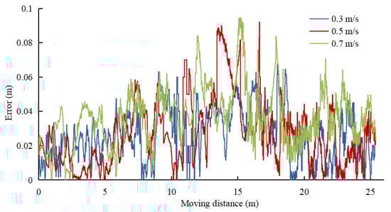 The lateral error of UWB/IMU/ODOM/LIDAR integrated positioning method is recorded at three moving speeds to verify the positioning accuracy of the positioning method in this paper at different speeds, and the results are presented in Figure 7. The lateral error of the robot platform in different moving speeds is analyzed, and the results are listed in Table 4. As revealed by the results, the lateral error increases slowly with the increase of the speed. At 0.7 m/s, the average lateral error is obtained as 0.036 m, the maximum error is 0.095 m, and the lateral RMSE is 0.04 m.