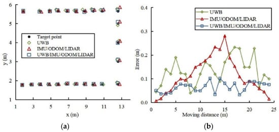 As part of this experiment, we compared the performance of the positioning system, the IMU/ODOM/LIDAR integrated positioning method, and the single UWB positioning. Twenty-four target points were set on the reference trajectory. The robot platform was manually controlled to track the reference trajectory, and guarantee that the center point of the robot platform coincides with the target point every time it reaches a target point. Every time the robot platform reaches a target point, halt and record the positioning data of different positioning methods at the current time for ten times and take the average value, and the positioning results are as depicted in Figure 8. As indicated by the results, the positioning accuracy of UWB in the greenhouse environment was between 0.04~0.23 m, whereas the positioning data fluctuated and was not consistent. The IMU/ODOM/LIDAR integrated positioning method produces accumulative error throughout robot platform movement, but its data continuity is strong, and the fluctuation is modest. An integrated positioning strategy using UWB/IMU/ODOM/LIDAR in conjunction with the other two positioning methods presented in this study provided the most accurate positioning results.