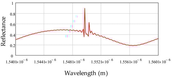 As it can be seen from Figure 3, the ACFOS spectrum response is comprised of a sinusoid-like spectral shape formed by the Fabry–Perot cavity and two narrow peaks formed by FBGs. It must be noted that the spectral response contains dips near the reflection peaks of FBGs, which can be explained by the interference of waves reflected from the FBGs, which received a phase shift when passing through the Fabry–Perot cavity.