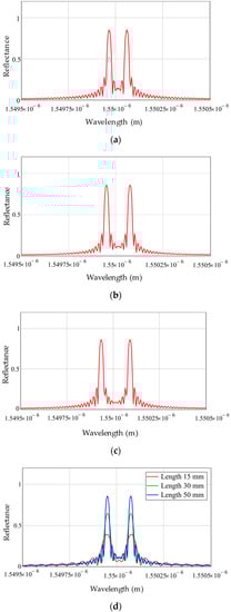 Sensor multiplexing is based on the address measuring conversion for the AFBS, namely: “the AFBS central wavelength—the difference frequency between the first and the second FBG components of AFBS—the photodetector output beat frequency—the AFBS microwave frequency address”. Simulations of the AFBS sensors with different address frequencies were performed. The dependence of the address frequencies on the grating period of the constituent FBGs in the range up to 20 GHz was obtained (Figure 4). The address frequencies of 8, 15.6 and 19.2 GHz were obtained. The dependence of AFBS spectral response on the FBG length was also established, as shown in Figure 4d. With the increase in FBGs lengths, their reflectance also increases. Therefore, a tradeoff between the sensor length and the reflectance must be achieved. The dependence clearly demonstrates the possibility of sensor multiplexing in a narrow wavelength range compared to the operating wavelength of 1550 nm with full addressability.