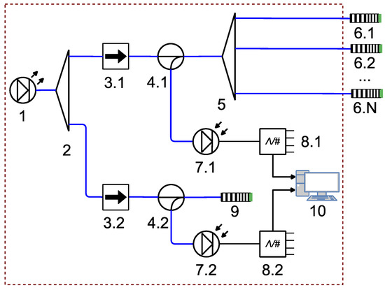 The structural diagram of the designed system working on the reflection principle is shown in Figure 5. Sensors (6.1)–(6.N) are mounted remotely, and the microwave photonic interrogator is mounted in the automated control rack. The light source (1) is a broadband laser diode (LD) in the range of 1550 nm. Its temperature must be stabilized by the thermoelectric controller, which is critical for ensuring the stable output power of the light source over the operating wavelength range. The optical radiation from the source (1) is divided into two channels by means of an fiber-optic splitter (2) in order to compensate for possible instabilities in the LD output power through the normalization of the signal amplitudes in both channels. In channel 1, the reflected radiation from ACFOSs (6.1)–(6.N) connected through splitter (5) is directed to the photodetector (7.1) through the optical circulator (4.1), while source (1) is isolated from the reflected radiation by optical isolator (3.1) (>20 dB). Each ACFOS can use FPR with different polymer films. The output signal of the photodetector (7.1) is converted by means of the analog-to-digital converter (ADC) (8.1) and processed by the computer (10). Similarly, in channel 2, the radiation reflected from the reference sensor (9) is guided to the photodetector (7.2) through the circulator (4.2), while the source is isolated from it with the isolator (3.2). The reference sensor (9) has the reference spectrum equal to the spectrum of the measurement sensor at the calibration points. This allows the additional consideration of variations in LD parameters. The output signal of the photodetector (7.2) is also converted by the second ADC (8.2) and processed by the computer (10).