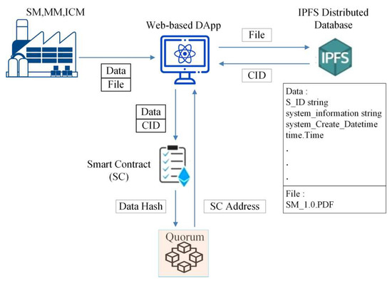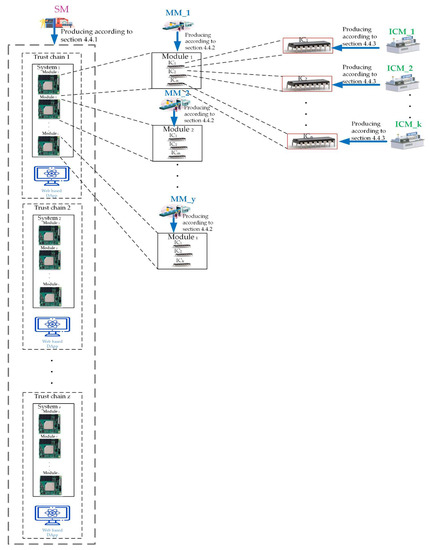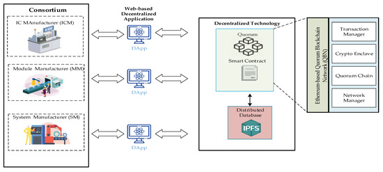 In this work, the system manufacturers could use this framework to store necessary information about finished products on blockchain to protect their finished products from copyright infringement and counterfeiting. The Quorum blockchain technology allows encrypted data to be visible only to the parties participating in the transaction, and therefore the system is based on this principle. The production process of a new system starts from the system manufacturer’s request to the module manufacturer. Figure 1 shows the distributed chain flow for system manufacturers, including System Manufacturer (SM), Module Manufacturer (MM), and IC Manufacturer (ICM), forming a chain of alliances. The proposed framework allows the verification and recording of completed data immediately.