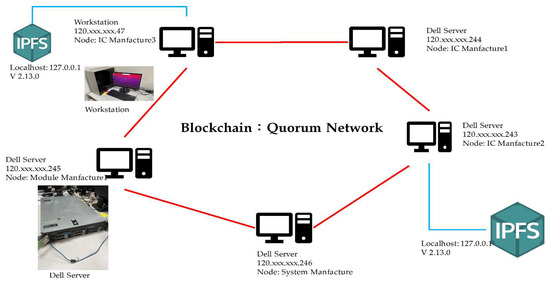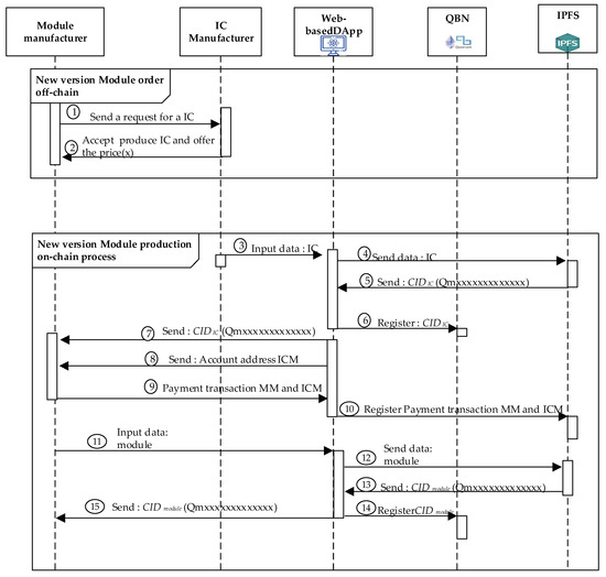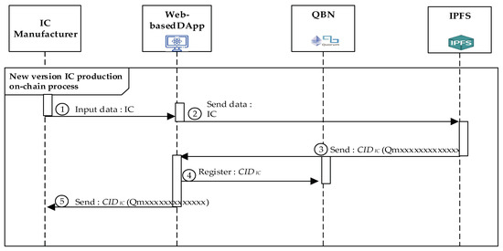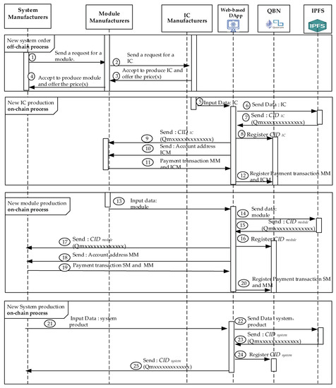 After completing the phases of a system design of SM, module design of MM, and IC design of ICM shown in Figure 5 from Step 1 to Step 4, the new IC production, new module production, and new system production are performed from Step 5 to 25, separately. Next, the three main processes for the implementation platform are proposed and presented in this section. The details of the all-party are necessary to realize the three proposed processes. The initial step will register participants in the consortium blockchain [45]. Next, the system, module, and IC will be registered separately in the private Quorum blockchain we created. Both Quorum blockchain and IPFS store every transaction as a transaction record.