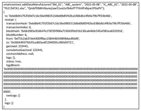 When experimenting with the scheme, the ether exchange rate was referenced by the Foreign Exchange (FX) website (also referred to on https://fx-rate.net/ETH/USD/ accessed on 14 June 2022); the ether exchange rate reached a high of USD 3810.525 per ether and a low of USD 1,124.493. Furthermore, the median of the highest and lowest, USD 2,726.836, will be the benchmark in calculating costs in our system. Multiplying the gas required to perform the appropriate function by the current value of the ether, we get the price. Utilize Remix to determine the amount of gas required to run our system’s functionalities. The Remix is a web-based integrated development environment (IDE) for developers creating Solidity DApps. The output of the system function execution is shown in Table 6. The evaluation results show that the proposed scheme could work in practice under the much lower costs, compared to the public blockchain, with a total cost o “0.002094” in Ether. According to the highest, the lowest, and the average dollar price as the reference (https://fx-rate.net/ETH/USD/ accessed on 14 June 2022) the most increased initial production cost for the recorded contract is USD 7.97922888. The lowest initial cost is USD 2.354688342, and the average price for each production is USD 5.709994584.