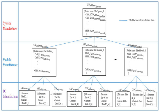 At the system manufacturer layer, the customized product, system_1, is the top parent node in the Merkle DAG tree. The top node system_1 contains the folder name and all CID hash values of the modules and ICs via his children links to each module node. The result forms HCIDs of interrelated directories and subdirectories, which are used to create a system-level trust chain.