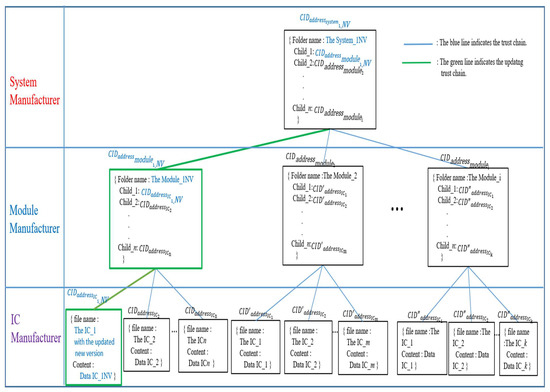How to update any version data of IC, module, or system is an additional essential issue that HCIDM has to address. Each IPFS file has an associated hash address. When the IPFS stored file is modified, the hash address will be changed, too. Whenever any new version data of IC, module, or system is added to an IPFS network, it will be assigned a new CID which is a unique hash value of the new version data of IC, module, or system. In traditional IPFS networks, it is identified and referenced in this way. Recalculating the hash when retrieving the file will verify its integrity. Modified files will fail the verification. When a file is legally modified, IPFS takes care of versioning the file. It indicates that the updated version of the file is stored with the new CID, and the previous version of the old file could be kept and retrieved via the previous CID. Figure 12 describes how to update the information for the updated IC version by using Merkle DAG employed by HCIDM. The first step is to create a Mutable File System (MFS) directory [43]. In Case 2, if anyone wants to add or update any version of IV, module, or system in this HCID tree, the hash values of the leaf nodes and subdirectory nodes regarding the related path will be changed, too. In this Case 2, the ICM makes IC_1 with a new version. Then the IC_1 with the new version will get a new CID (). The module node in Figure 12, which is the parent of the IC node with the new IC_1 version, will update the link directory by updating a new CID value retrieved by IPFS implemented in this framework. After updating all the related files whose links are belonging to updating the Merkle DAG path, for example, , the parent module will get a new CID hash value . The system_1 node in the system build layer will also update the directory by updating the CID for the updated module , then the system_1 node will get the new hash value . With this procedure, the trust chain could be updated, via Merkle DAG employed by HCIDM, to be the new latest trust chain according to Definition 1 or Definition 2.