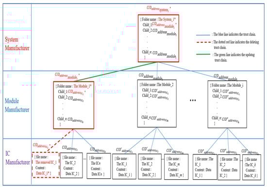 The HCIDM preserves the history of computing devices by keeping each stored file version and building a solid network for data mirroring. Each participant, ICM, MM, or SM uses the web-based DApp, based on HCIDM, to automatically store, update and manage the version data of their product. Figure 13 describes how a version data file is deleted in the ICM leaf node. ICM will carry out the garbage collection process both manually and automatically. In this case, the file to be deleted has a CID hash value (). ICM will delete the version data file regarding an old IC chip in order to revoke it. ICM will then publish the revoked information to the MM who is his parent node. Next, MM will update the file in this IPFS in order to get a new CID hash value . After getting updated information from the associated child module(s), SM will also update the contents in his folder shown in Figure 13 and get the new CID hash value . With this procedure, the trust chain could be updated to be the new latest trust chain according to Definition 1 or Definition 2. By carrying out this procedure, the security for the trust chain could also remain secure and solid.