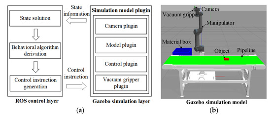 To facilitate the development of capture and placement control system, a simulation platform was built by combining robot operating system (ROS) and Gazebo simulator. All the experiments were performed on this platform. ROS is an open-source meta-operating system that provides many services for robots, including hardware abstraction, underlying device control, implementation of common functions, inter-process messaging, and package management [27]. It can be used to drive real or simulated robots to perform various tasks. Gazebo is a mature 3D physical simulator that can be closely combined with ROS for simulation [28]. To obtain high simulation accuracy, Gazebo provides various underlying physics engine such as Ode, Bullet, Dart, and Simbody. Besides, it has rich interfaces for modeling, control, and visualization. In the virtual visual simulation environment, the robot model with physical properties can be created, and the robot motion and sensing data can also be simulated. Compared with the direct hardware operation, the simulation platform based on ROS and Gazebo is more suitable for the development and test of complex system due to the convenient parameter adjustment, fast operation speed, and low cost. The simulation framework of ROS–Gazebo is shown in Figure 1a, including the following processes: