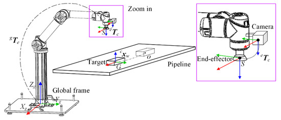 where denotes the end-effector’s pose in a global frame, i.e., the base coordinate system of manipulator, and represents the angle of six joints in joint space. The forward kinematics model of the manipulator is given in Appendix A. Target’s pose in global frame can be obtained according to the pose in camera frame by: