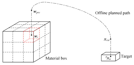The capture process will cost large amounts of computing resource by the machine vision and manipulator control system. However, the motion path of placement process can be offline planned based on the predefined waypoints, including pre-placing pose, placing pose, and post-placing pose, for reducing the computing cost. The schematic diagram of offline placement is shown in Figure 4. The target’s pose in global frame is obtained by the proposed motion estimation method, and it will be given in Section 4.2.1. The raising pose can be determined only by changing the z axis coordinate value of target’s pose. The placing pose of all targets in material box is predetermined according to the size of material box and target. In Figure 4, is the placing pose of the i-th target. At the same time, the pre-placing pose can be determined only by modifying the z axis coordinate value of placing pose. The joint angle control signal for placement operation can be obtained by inverse kinematics based on the pose of the key waypoints. As a result, the placement process avoids the online calculation, which helps to improve the operation efficiency.