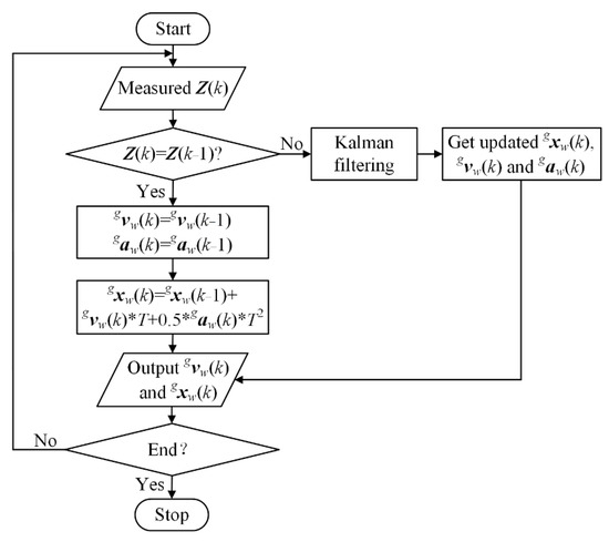 For the condition that Z(k) is different from the previous Z(k − 1), the Kalman filter is used to predict the upcoming measurement result. It computes the current estimation based on all past measurements and usually converges in a few iterations. Thus, the motion including velocity (k), acceleration (k), and pose (k) can be estimated by the same process, as described in literature [9]. One example of calculating the system state along x axis in global frame by Kalman filter method is given in Appendix C.