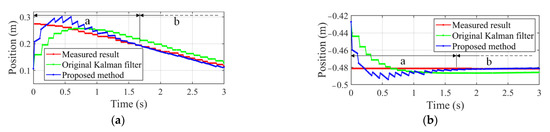 Measured result and estimated ones by original Kalman filter and proposed method. (a) Position along x axis. (b) Position along y axis.