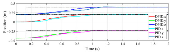 Specifically, a step response experiment was conducted to analyze the stability of PID controller with dead zone constraint (DPID). The results of the DPID controller and that of the general PID controller for comparison are shown in Figure 8. The desired positions of end-effector in global frame are set at 0.13 s, as marked by the black dotted lines. It can be noted that the adjustment time of DPID controller is smaller than that of the general one. Besides, the motion trajectory obtained by DPID controller is also smoother in the adjustment process, indicating that DPID controller benefits by reducing the jitter of manipulator. This is owed to the DPID controller avoiding frequent adjustment under the dead zone constraint.