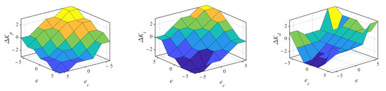 According to the above setting and fuzzy rules, the output surface of ∆Kp, ∆Ki, and ∆Kd on the domain are obtained as presented in Figure 9. The modified parameters ∆Kp, ∆Ki, and ∆Kd can be obtained by checking Table 1. Centroid defuzzification method is used to calculate the specific variation of PID parameters from the obtained fuzzy results. Finally, the self-tuning PID parameters are determined by Equation (13).
