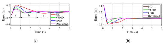 Firstly, the tracking error of manipulator end-effector for the low-speed moving target is shown in Figure 10. Taking the results obtained by the developed controller as an example, phase a featured with large changes in tracking error is the transition process of end-effector from the initial point to the near region of the moving target. Phase b denotes that end-effector approaches the near region of the moving target, which is characterized by a small variation in tracking error. Phase c indicates that the stable tracking is achieved, and the capture operation can be performed. From the results in Figure 10a,b, it can be observed that the FPID controller takes less time to reach the stable tracking stage than PID controller due to using the adaptively tuned PID parameters. VFPID controller has a faster response speed than PID and FPID controllers. Compared to the above controllers, the developed controller takes the least time to approach the stable tracking stage. The detailed time spent in phase a and b are presented in Table 2.