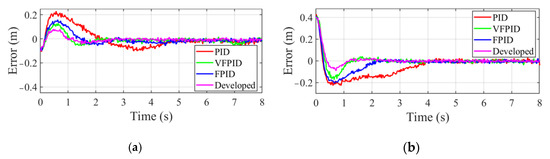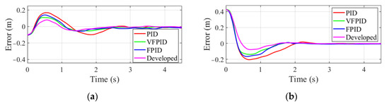 The tracking error from the initial pose of manipulator end-effector to the stable tracking phase is shown in Figure 13. It can be seen that the proposed VFPIDDF controller has better robustness and a higher response speed than other controllers.