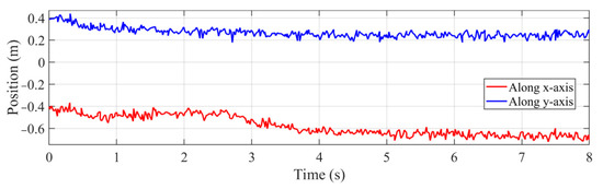 To examine the robustness of the developed controller, experiments are performed for the first time changing the target’s position by introducing large Gaussian noise in the measurement equation of Kalman filter, and for the second time introducing an angle disturbance to six joints, as shown in Figure 5. Gaussian noise with zero-mean value and 0.05 covariance is used as the measurement noise from camera. The target’s position along x and y axis on pipeline in the tracking process using the developed controller is shown in Figure 12.