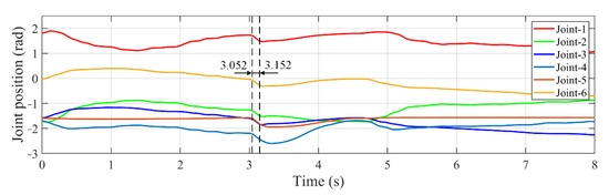 The disturbance with −0.15 rad is introduced to six joint angles between 3.052 s and 3.152 s, as shown in Figure 14. The tracking errors along x-axis and y-axis are presented in Figure 15a,b, respectively. It is seen that the tracking errors increase sharply under the influence of interference. Take the results obtained by the developed controller as an example, aex and aey denote the error variation amplitude caused by disturbance, and tex and tex indicate the adjustment time from appearing disturbance to return to the steady tracking state along x-axis and y-axis, respectively. Table 4 gives the results of error variation amplitude and adjustment time. It can be noted that through the adjustment of the developed controller, the tracking error not only has smaller amplitude, but also reaches the stable state more quickly than other controllers.