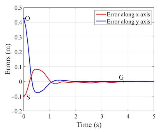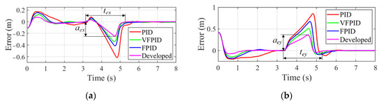 Variation of tracking error in the tracking process with −0.15 radian disturbance. (a) Error along x-axis. (b) Error along y-axis.