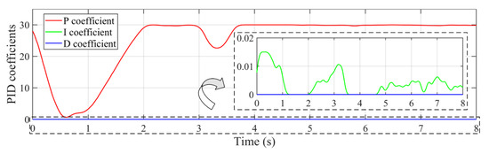 The PID coefficients of the developed controller are adaptively tuned during the tracking process in the presence of disturbance, which are presented in Figure 16. When there are large tracking errors, the velocity feedforward control plays a major role. Thus, a faster response is obtained by the developed controller than the PID controller. At this time, the proportional module plays a minor adjustment role with small proportional coefficient P. Near the stable tracking phase i.e., 1~2 s, the role of velocity feedforward decreases gradually as the tracking of errors decreases. At this time, the coefficient P tends to increase to further reduce the tracking error. During the stable tracking phase, the proportional coefficient P tends to be unchanged for high stability, and the integral coefficient I fluctuates to eliminate the steady-state error. The differential coefficient D is almost zero, because there is no significant position tracking lag under the control of velocity feedforward module.