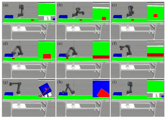 The key frames in the autonomous operation experiment. (a) Initial pose. (b) Transition phase. (c) Start tracking. (d) Before grasping. (e) Perform grasping. (f–h) Lift object, perform pre-placement and placement. (i) Return to initial pose.