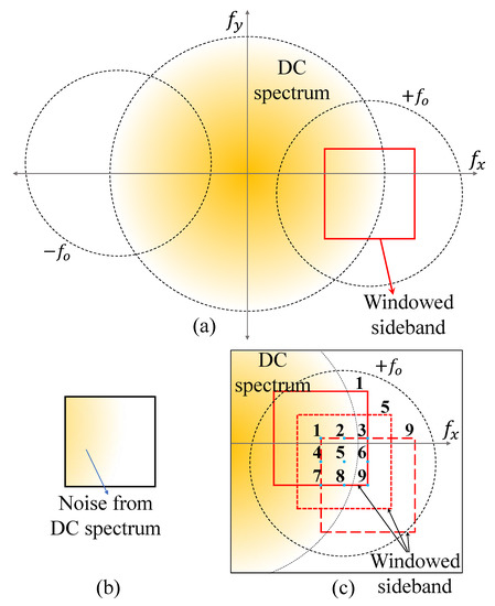 Figure 1a,b show the problem for the image processing of DHM. Figure 1a shows the process of windowing sidebands in Fourier domain. in Figure 1a denotes and in Equation (2) for each sideband [13,15,16,24]. That is, it can be seen through Equation (2) that the phase difference information is contained in the sideband of Fourier domain. Therefore, to obtain the phase difference information of the object, it is necessary to window the area in Fourier domain as depicted in the red square in Figure 1a. Since the detailed shape information depends on the high spatial frequency component of the object in this process, the windowing range has to be wide. However, as this range approaches the origin in Fourier domain as depicted in Figure 1b, DC noise may increase. In addition, it is not easy to avoid this noise because the DC spectrum is distributed throughout the entire Fourier domain unlike that shown in Figure 1a. To solve this trade-off, we propose a DHM filtering method in the next subsection.