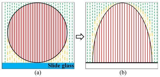 Figure 2 describes the difference between real depth information of the object and depth profile by DHM. The object as shown in Figure 2 is a microsphere that is used for calibration of DHM system. In Figure 2, the red solid line, the green dotted line, and the yellow dash-single dotted line illustrate the light path passing through the object, the light path passing through the top of an object or not passing through an object, and the light path passing through the lower part of the object, respectively. As a result, the depth profile by DHM shows accurate height information but does not show the same shape as the object. However, to compare our proposed method with conventional filters, we need an ideal comparison target. Therefore, for comparison, we construct microspheres with a size of 10 µm as an ideal target using the following: