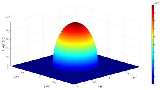 where is the 3D height data of the ideal comparison target, which is derived to create an ellipsoid centered at the origin with a diameter of 10 on the x, y-axis and 20 on the z-axis by applying the spherical equation. Then, it multiplied by for comparison with the target size of 10 µm, and the final height information data is limited to 0 or greater. As a result, we can obtain a half-ellipsoid with both width and height of 10 µm.
