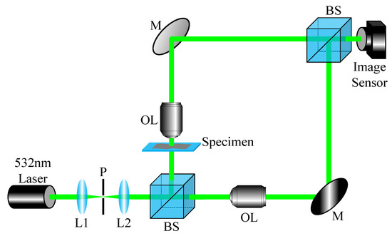 Experimental setup. L: lens, P: pinhole, M: mirror, BS: beam splitter, and OL: objective lens.