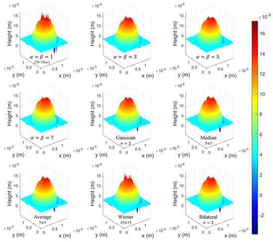Table 1 shows the numerical comparison results by calculating MSE, SNR, and PSNR between the ideal target and 3D profile results by various filters. The numerical results by our proposed method are better than others as the number of and increases. This is because the proposed method filters the noise while maintaining the shape details and accurate height information of the object.