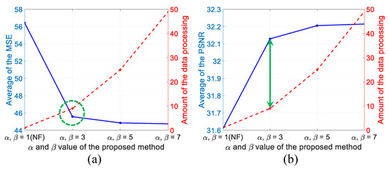 Comparison between the data processing time and filtering effect using (a) MSE and (b) PSNR. Blue line means result of each metric and red dotted line means amount of the data processing.