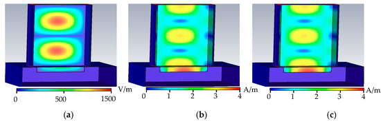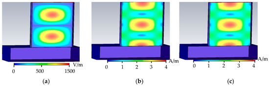 No-defect field distribution. (a) No defect electric field distribution. (b) No defect magnetic field distribution. (c) No defect wall current distribution.