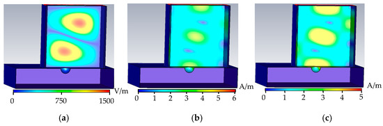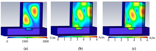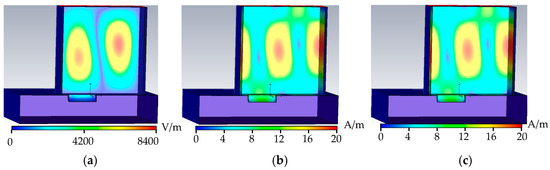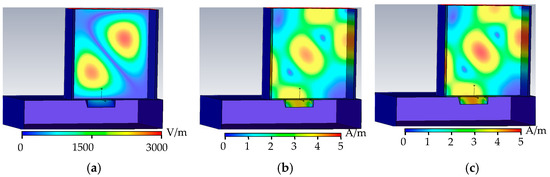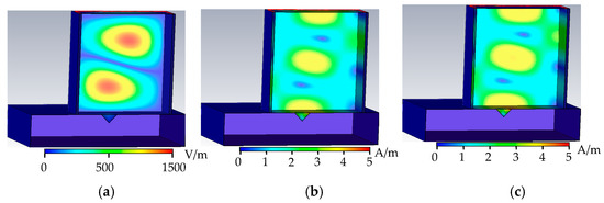 Crack defect field distribution. (a) Crack defect electric field distribution. (b) Crack defect magnetic field distribution. (c) Crack defect wall current distribution.