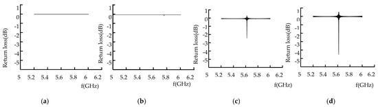 As shown in Figure 11, when the metal surface has no defects, the return loss is 0 dB; when the metal surface defect is a crack, the return loss is −0.11 dB; when the surface defect is a triangular prism, the return loss is −2.41 dB; and when the metal surface defect is a trapezoid, the return loss is −4.51 dB.