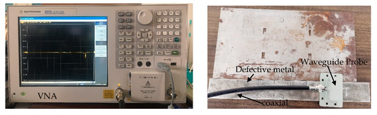 As shown in Figure 13, the vector network analyzer transmits and receives microwaves. The rectangular waveguide converted the TEM waves in the coaxial cable into TE01-mode microwaves propagating in the rectangular waveguide. The microwaves were reflected from the metal surface. The energy change was used to detect metal surface defects.