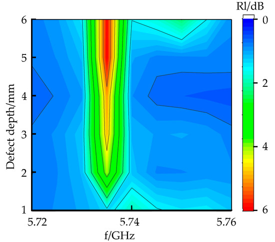As shown in Figure 15, as the depth of the defect increases, the detection frequency is 5.735 GHz. As the depth of the defect increases, the return loss values are −3.078, −4.72, −5.3, −5.45, −6.15, and −6.2 dB; the energy loss at the defect increases; and the return loss value of the microwave reflected wave at the defect increases.