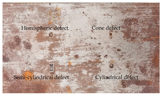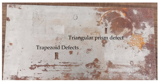 The crack width on the metal surface was 0.3 mm, the depth was 1–6 mm, the defect length was 5 cm, and the defect interval was 5 cm. Metal plates with different depths of crack defects are shown in Figure 14.
