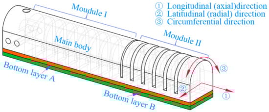 Module one of the soft actuator has nine chambers, and module two has six chambers. Cross-sections of two kinds of chambers along the axial direction and radial direction are shown in