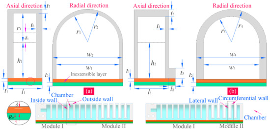 Table 1. When inflated, the chamber of module one will expand and deform mainly along the axial direction of the soft actuator since the thickness of its outside wall is smaller than those of the inside walls between the adjacent chambers. In the meanwhile, the pressure on both sides of each inside wall is equal. Compared with the bending deformation of the chamber of module one, that of module two presents a different form. Because the thickness of the lateral wall is smaller relative to that of other walls, the lateral wall is easier to expand, making the expanded lateral walls of the adjacent chambers squeeze each other. Owing to the existence of the inextensible layers, two modules will bend to the side of the inextensible layers.