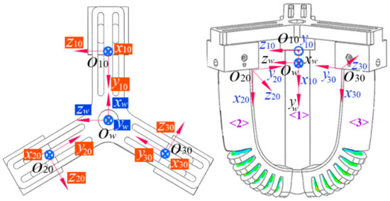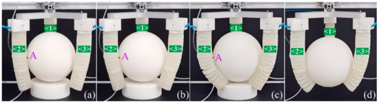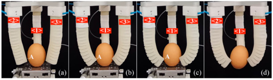 Figure 14a that the tips of the soft actuators edge a little close to the egg. At this time, a pressure of 14.1 kPa, which is slightly more than the theoretical value (13.9 kPa), is applied to pneumatic module two, and it can be seen the soft actuator’s tip just makes contact with the egg near the target point A, as shown in