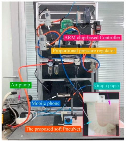 Figure 8. Two proportional pressure regulators (VPPM-6L, Festo Ltd., Esslingen am Neckar, Germany), which have an output range of 0–600 kPa with a linearity error of ±1% FS, were used to adjust the input pressure of the actuators. A self-developed ARM microprocessor-based controller was used to control the outputs of the regulators. Module one of the actuator is controlled by one proportional pressure regulator, and module two by the other one. Since two modules are controlled by different regulators, the soft actuator can work at different pressure combinations. Moreover, graph papers with a minimum scale of one millimeter were utilized to offer information on the bending angle and location.