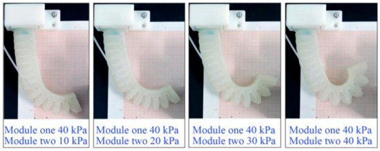 During the trials, the pressure for module one of the soft actuator was limited to a range of 0–80 kPa with an increment of 10 kPa, and that for module two was limited to a range of 0–40 kPa with an interval of 5 kPa; thus, a total of 81 pressure combinations were used.