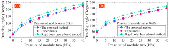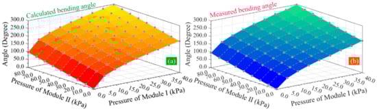 Figure 11a. From the deviation between them, it can be seen that when the pressure of module two keeps constant, the deviation between the predicted and measured angle remains at a relatively stable state, indicating that the increase in the pressure of module one has little impact on the deviation. When the pressure of module one remains constant and that of module two is bigger than 5 kPa, the deviation tends to reduce with the increase in the pressure of module two, indicating that the pressure of module two has a more significant impact on the deviation, and the bending angle model can give a relatively accurate prediction when a bigger pressure is applied to module two of the soft actuator. Throughout the deviation, the maximum deviation is 9.13°, the minimum deviation is −2.28°, the mean deviation is 4.13°, and the standard deviation is 2.89°. When the pressure of module two is bigger than 5 kPa, all deviations are less than 8%. The comparison results show that the bending angle model has an expected agreement with the experimental results.